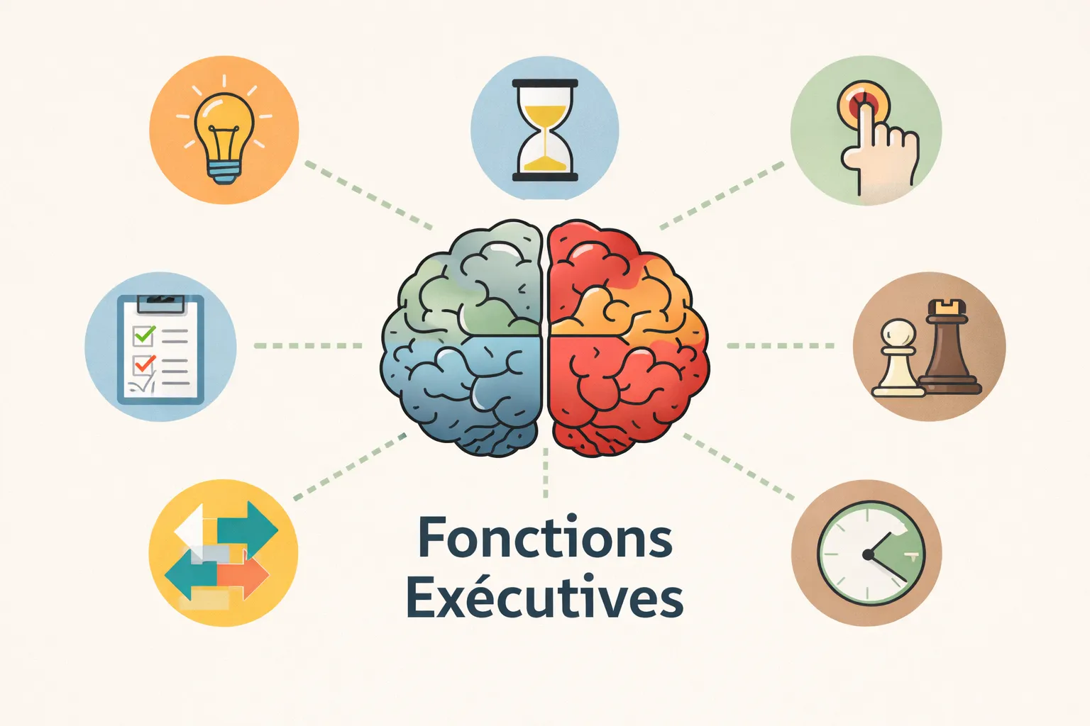 Derrière ce terme de fonctions exécutives, on trouve un ensemble de « fonctions » qui nous permettent de planifier une action, la mettre en œuvre, évaluer son résultat, corriger et réorienter. C’est au travers ces différents aspects que l’on s’aperçoit d’un problème: on parle d’oubli alors qu’il y a eu distraction, on n’arrive pas à rester en place car l’esprit ne peut rester sur une activité qui dure…